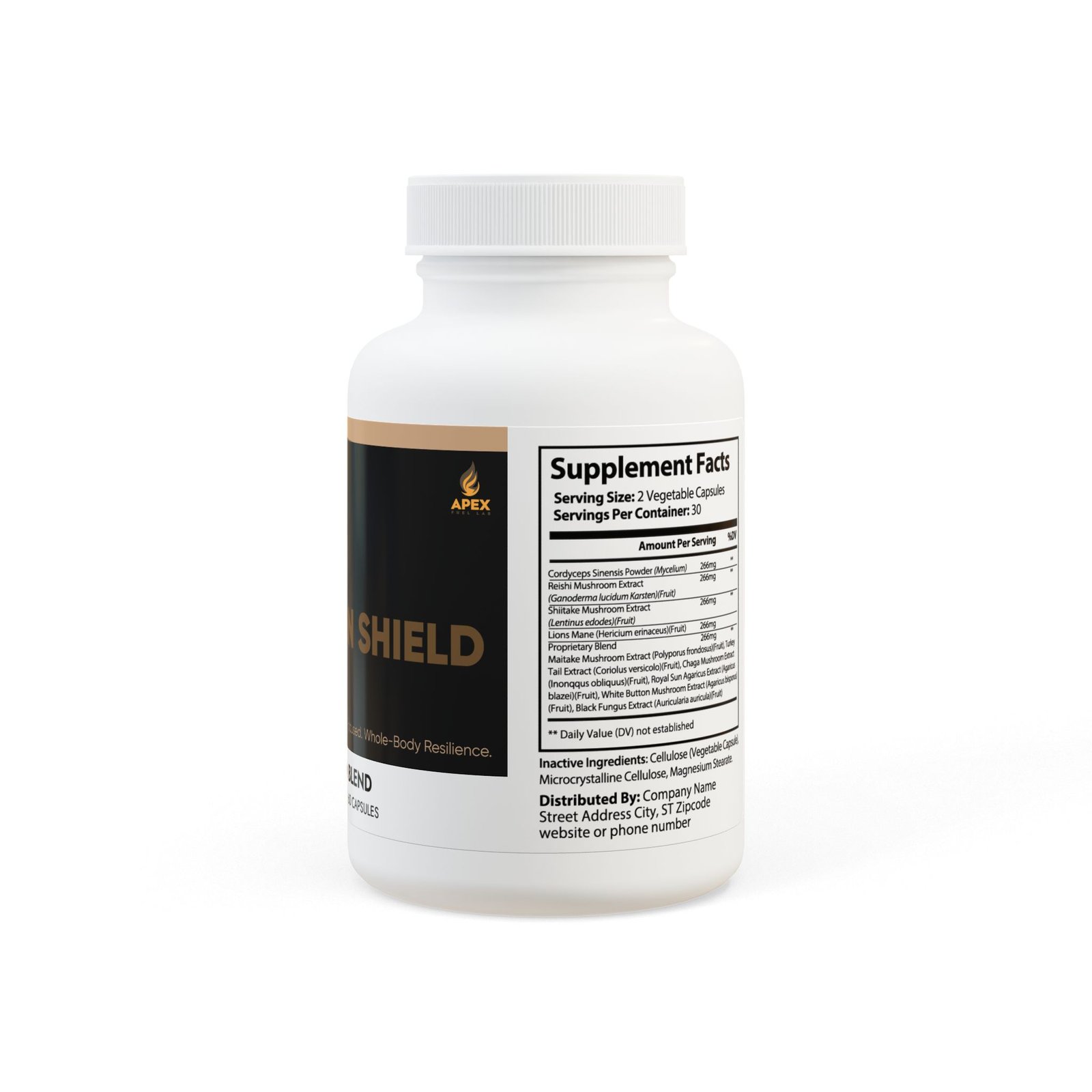 Ingredients: Cordyceps Sinensis Powder (Mycelium), Reishi Mushroom Extract, (Ganoderma lucidum Karsten)(Fruit), Shiitake Mushroom Extract, (Lentinus edodes)(Fruit), Lions Mane (Hericium erinaceus)(Fruit), Proprietary Blend, Maitake Mushroom Extract (Polyporus frondosus)(Fruit), Turkey Tail Extract (Coriolus versicolor)(Fruit), Chaga Mushroom Extract, (Inonqqus obliquus)(Fruit), Royal Sun Agaricus Extract (Agaricus blazei)(Fruit), White Button Mushroom Extract (Agaricus bisporus), (Fruit), Black Fungus Extract (Auricularia auricula)(Fruit), Cellulose (Vegetable Capsule), Microcrystalline Cellulose, Magnesium Stearate.