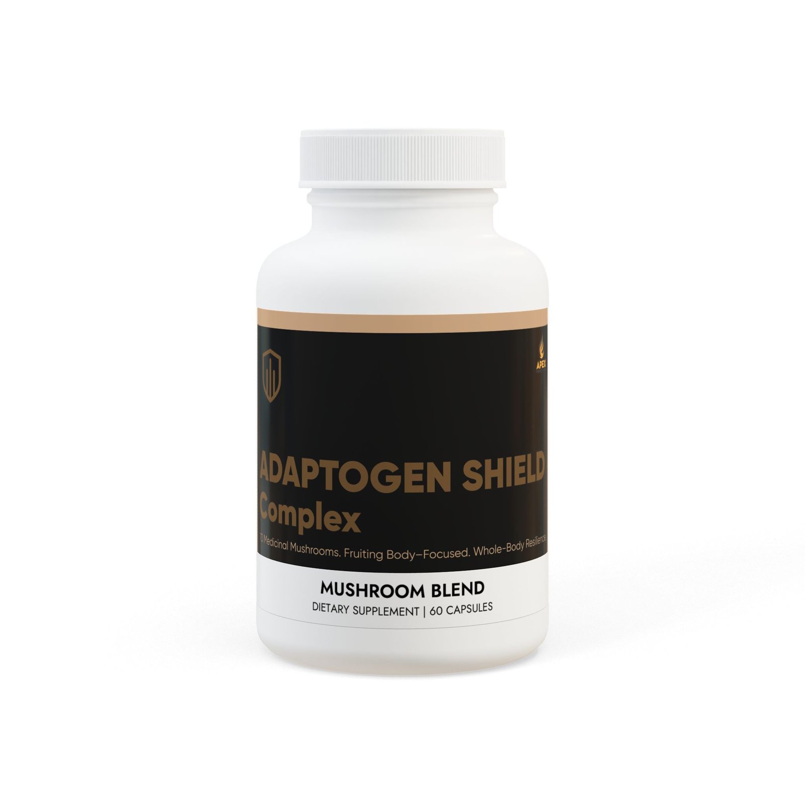 Adaptogen Shield Complex unites 10 powerful medicinal mushrooms—including Lion’s Mane, Cordyceps, Reishi, Shiitake, Turkey Tail, and Chaga—sourced primarily from fruiting bodies (the most bioactive part of the mushroom) to deliver broad-spectrum support for immune resilience, natural energy, and cognitive vitality.
