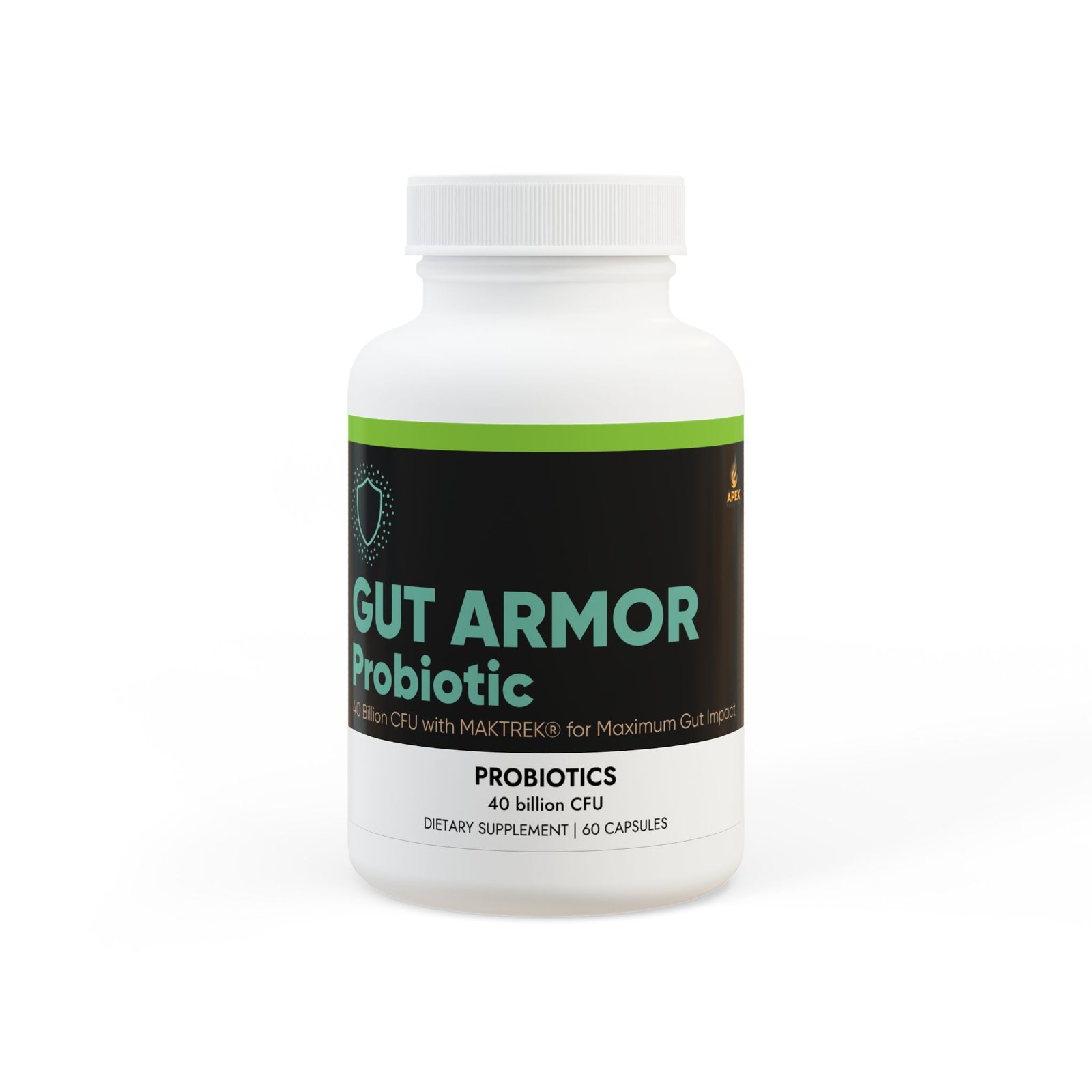 Gut Armor Probiotic delivers 40 billion CFU of clinically studied probiotic strains—including Lactobacillus acidophilus, Bifidobacterium lactis, L. plantarum, and L. paracasei—to support a healthy gut microbiome, immune resilience, and reduced exercise-induced muscle stress.