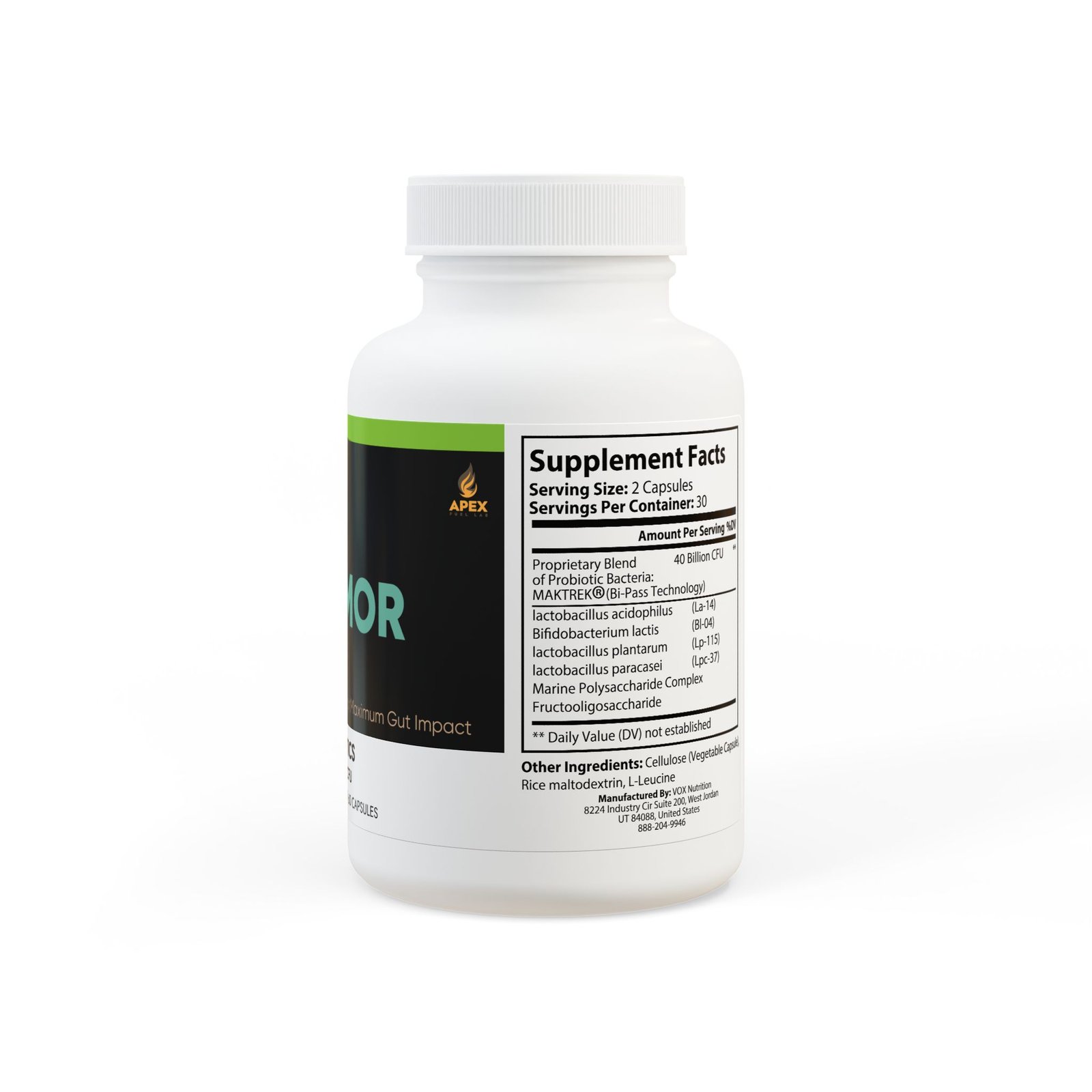 Ingredients: Proprietary Blend 40 Billion CFU of Probiotic Bacteria: MAKTREK (Bi-Pass Technology), lactobacillus acidophilus (La-14), Bidobacterium lactis (Bl-04), lactobacillus plantarum (Lp-115), lactobacillus paracasei (Lpc-37), Marine Polysaccharide Complex, Fructooligosaccharide ®. Other Ingredients: Cellulose (Vegetable Capsule), Rice maltodextrin, L-Leucine
